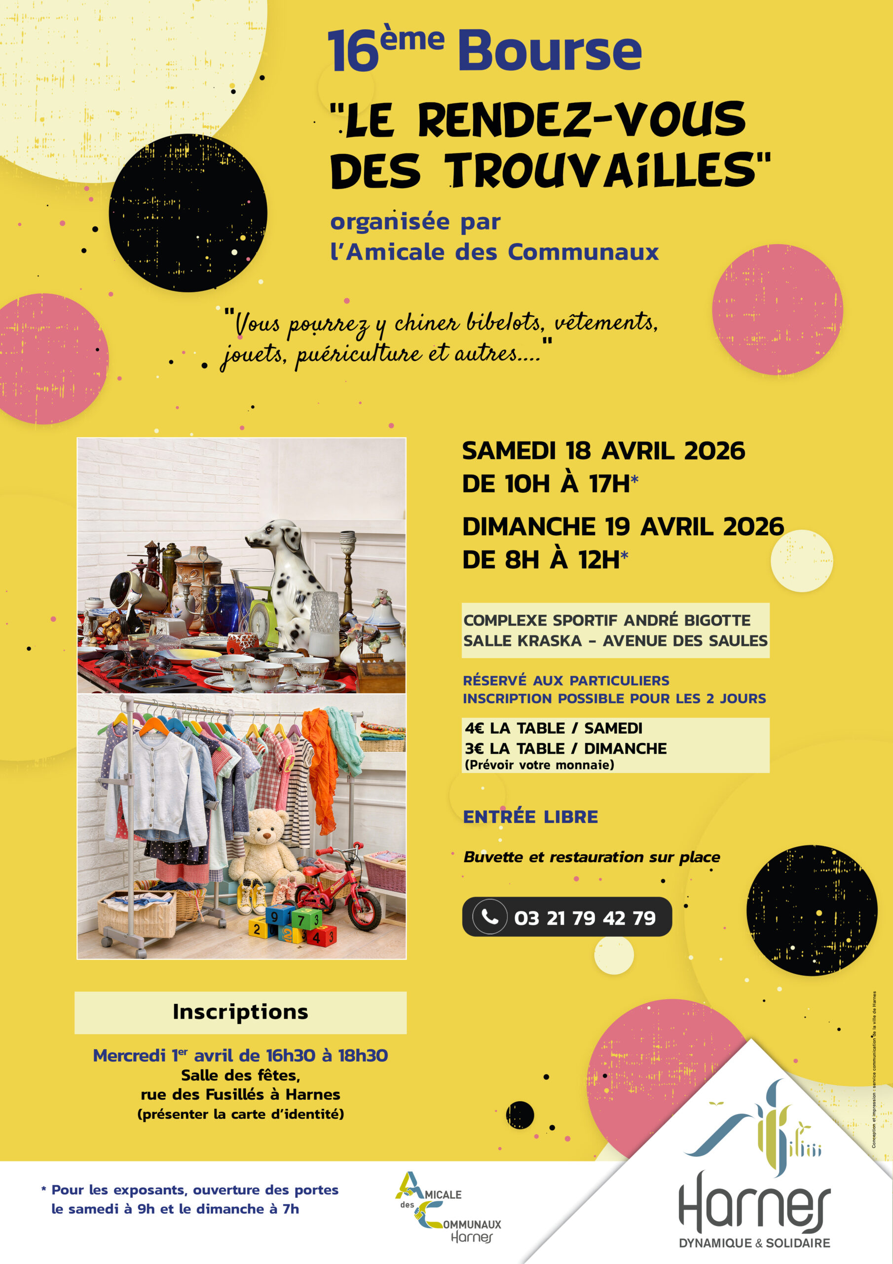 16ème Bourse « Le rendez-vous des trouvailles » + Ajouter à mon Agenda Google + iCal / Outlook export 00 jours 00 heures 00 minutes 00 secondes Date 18 Avr 2026 Heure 8 h 00 min - 18 h 00 min Lieu Complexe A. Bigotte Organisateur Amicale des Communaux de Harnes Partagez cet événement