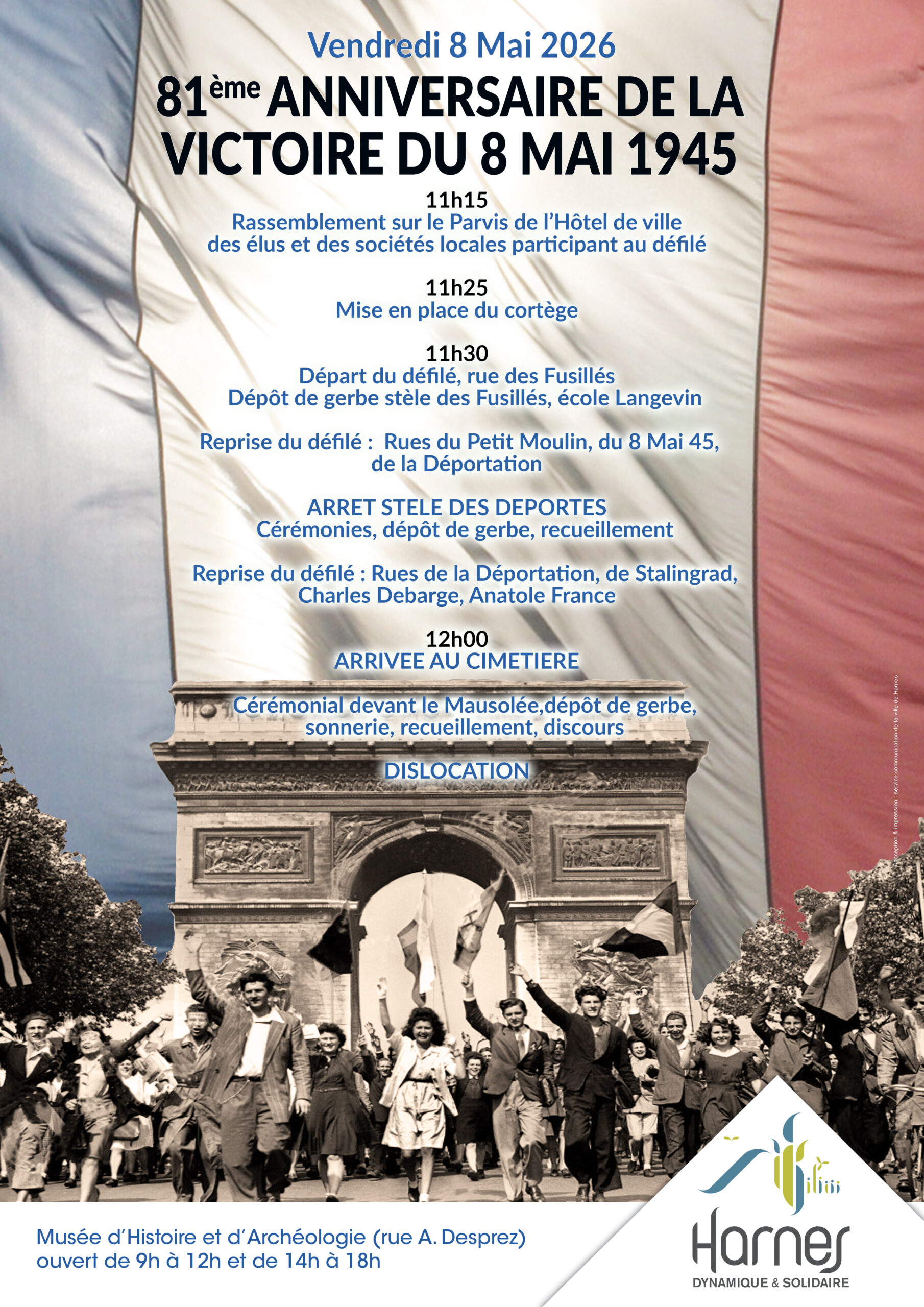 81ème anniversaire de la victoire du 8 mai 1945 + Ajouter à mon Agenda Google + iCal / Outlook export 00 jours 00 heures 00 minutes 00 secondes Date 08 Mai 2026 Heure 11 h 15 min - 12 h 00 min Lieu Parvis de l'Hôtel de ville Organisateur Municipalité Téléphone 0321794285 Email communication@ville-harnes.fr Partagez cet événement