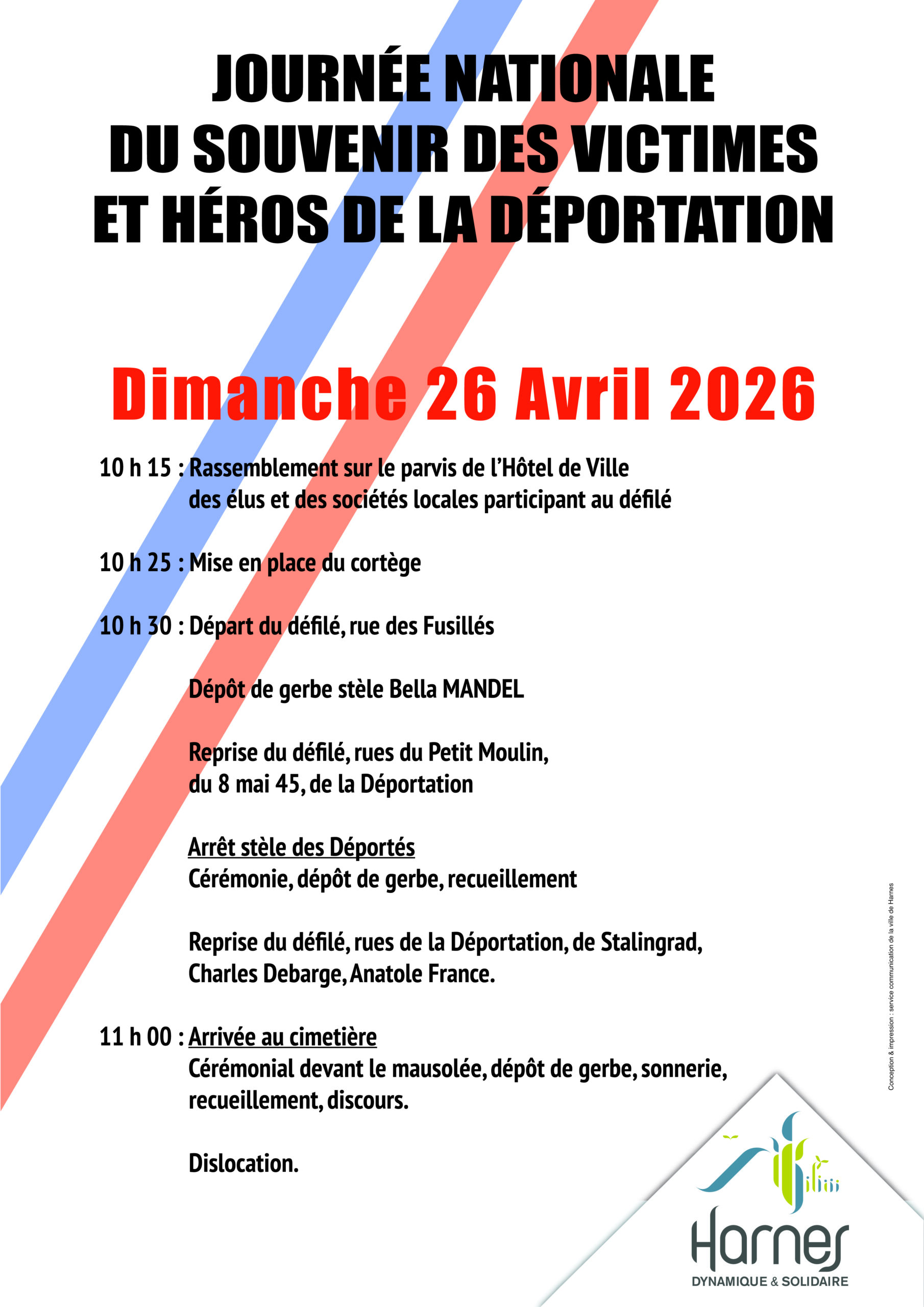 Journée Nationale du souvenir des victimes et héros de la déportation + Ajouter à mon Agenda Google + iCal / Outlook export 00 jours 00 heures 00 minutes 00 secondes Date 26 Avr 2026 Heure 10 h 15 min - 11 h 00 min Lieu Parvis de l'Hôtel de ville Organisateur Municipalité Téléphone 0321794285 Email communication@ville-harnes.fr Partagez cet événement