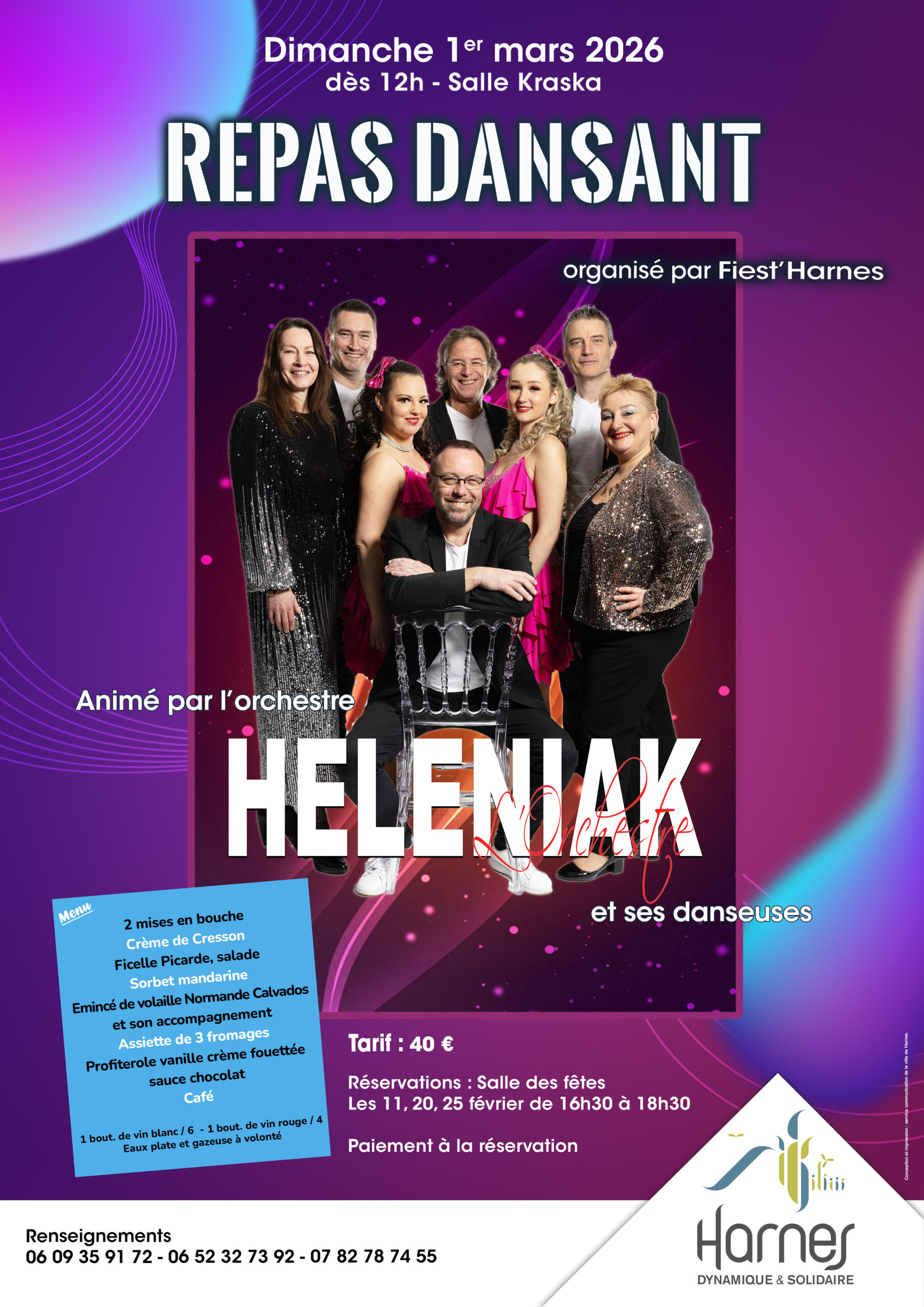 Repas dansant – Fiest’Harnes + Ajouter à mon Agenda Google + iCal / Outlook export 00 jours 00 heures 00 minutes 00 secondes Date 01 Mar 2026 Heure 0 h 00 min Lieu Salle Kraska Avenue des Saules Organisateur Fiest'Harnes Téléphone 06.52.32.73.92 / 06.29.87.53.50 Partagez cet événement