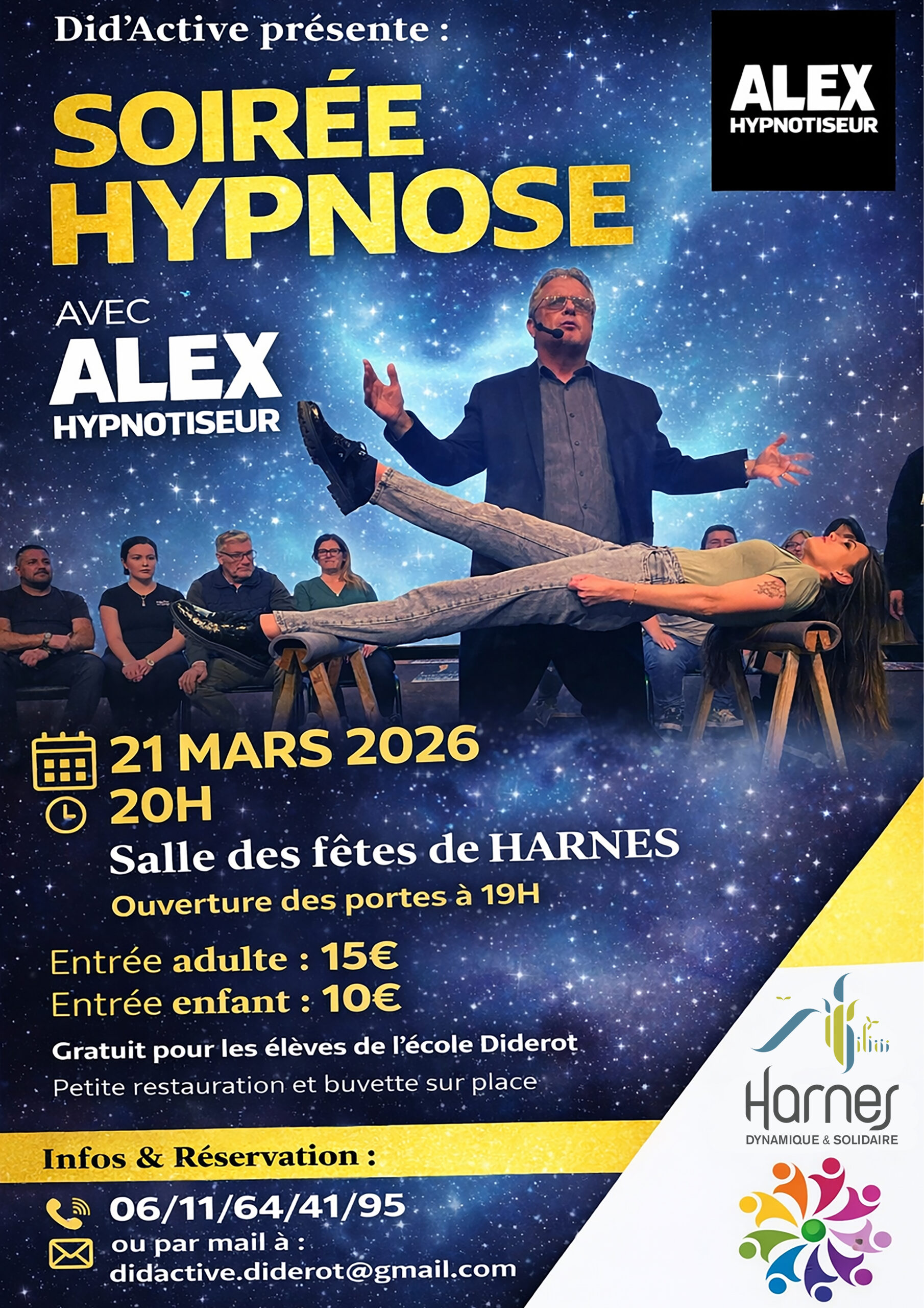 Soirée Hypnose + Ajouter à mon Agenda Google + iCal / Outlook export 00 jours 00 heures 00 minutes 00 secondes Date 21 Mar 2026 Heure 20 h 00 min Lieu Salle des Fêtes 93 Rue des Fusillés Organisateur Did'Active Partagez cet événement