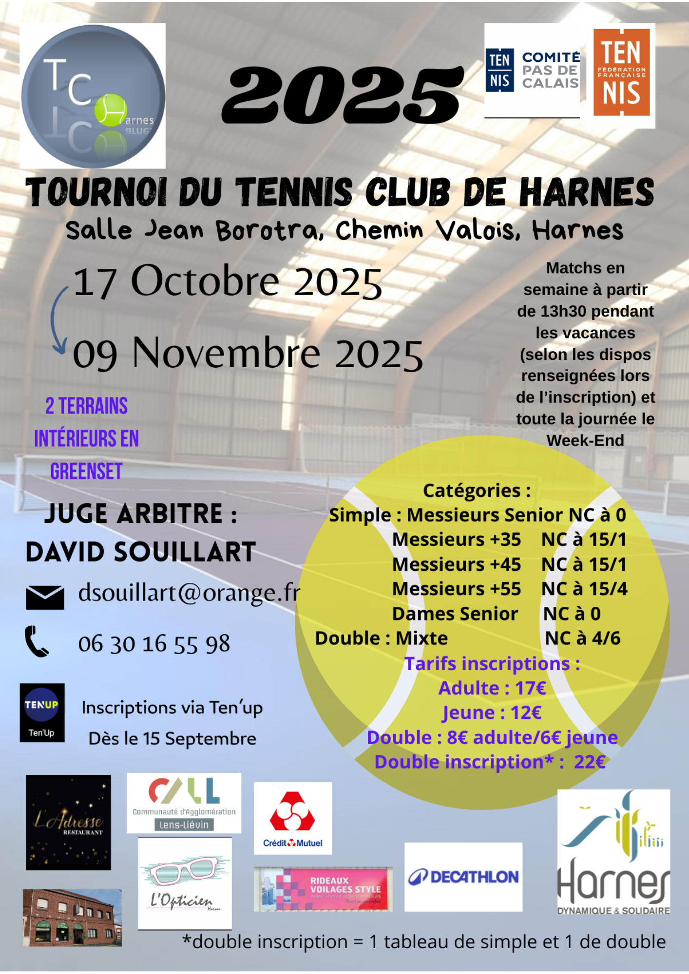 Tournoi du Tennis Club de Harnes + Ajouter à mon Agenda Google + iCal / Outlook export 00 jours 00 heures 00 minutes 00 secondes Date 17 Oct 2025 - 09 Nov 2025 Organisateur Tennis Club de Harnes Partagez cet événement