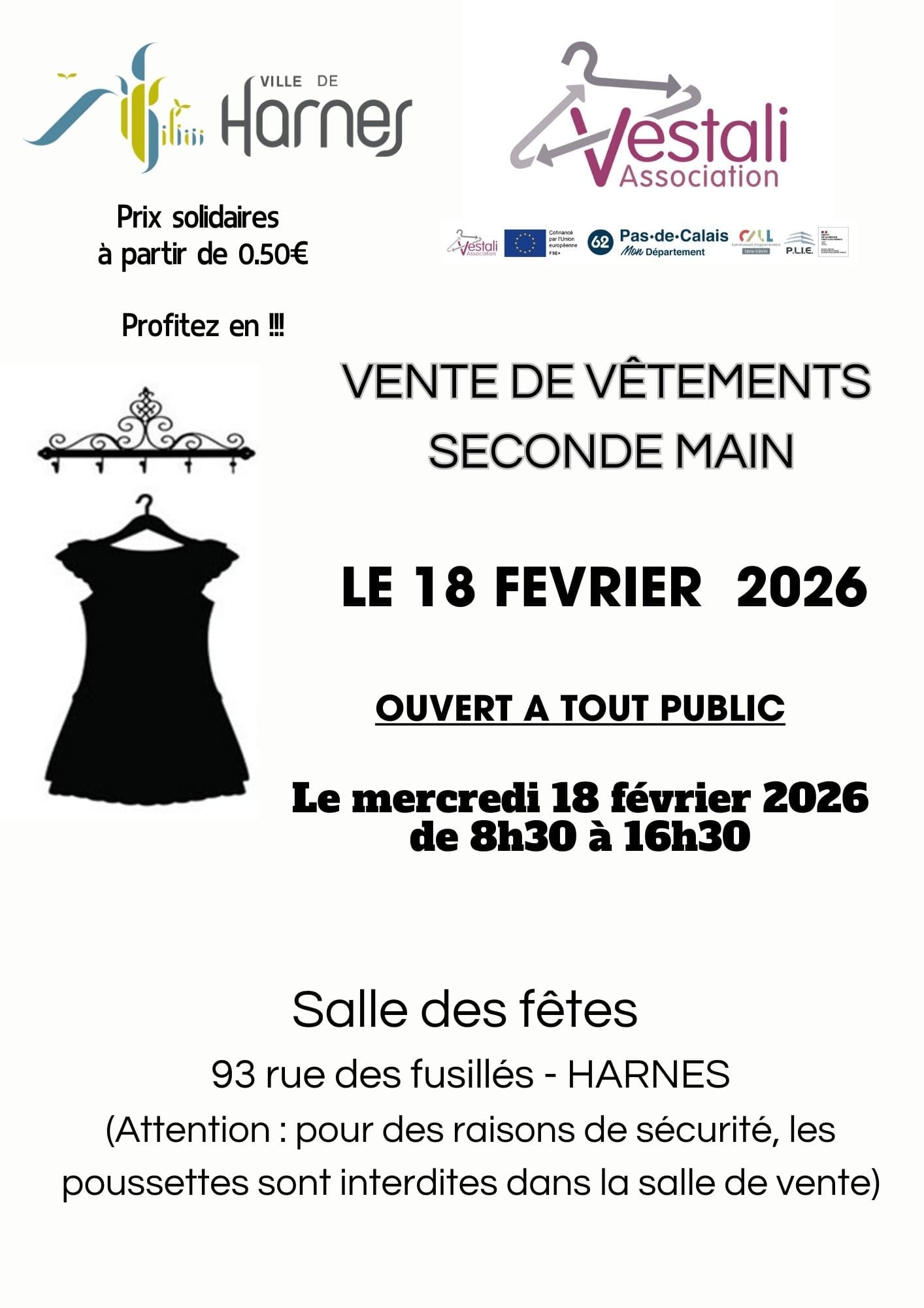 Vente de vêtements seconde main + Ajouter à mon Agenda Google + iCal / Outlook export 00 jours 00 heures 00 minutes 00 secondes Date 18 Fév 2026 Heure 8 h 30 min - 16 h 30 min Lieu Salle des Fêtes 93 Rue des Fusillés Partagez cet événement